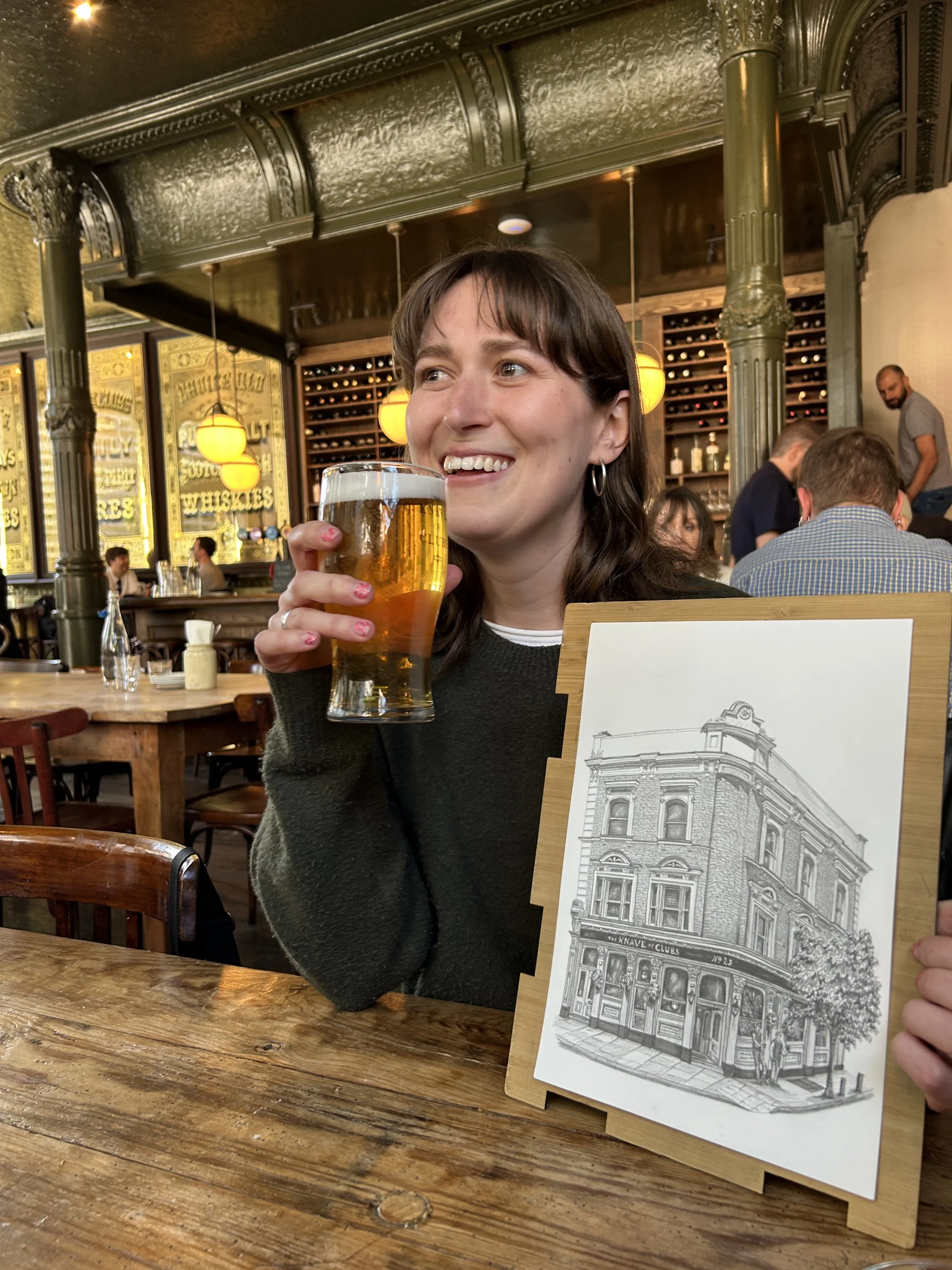 Lydia was born in Ealing, West London and studied Fine Art at Goldsmiths University, she then went on to teach children art across schools in South London before focusing on her own practice and drawing pubs from 2020. She lives in South East London, and when she’s not out sketching and exploring pubs across the city; she’s working from her studio in Deptford.